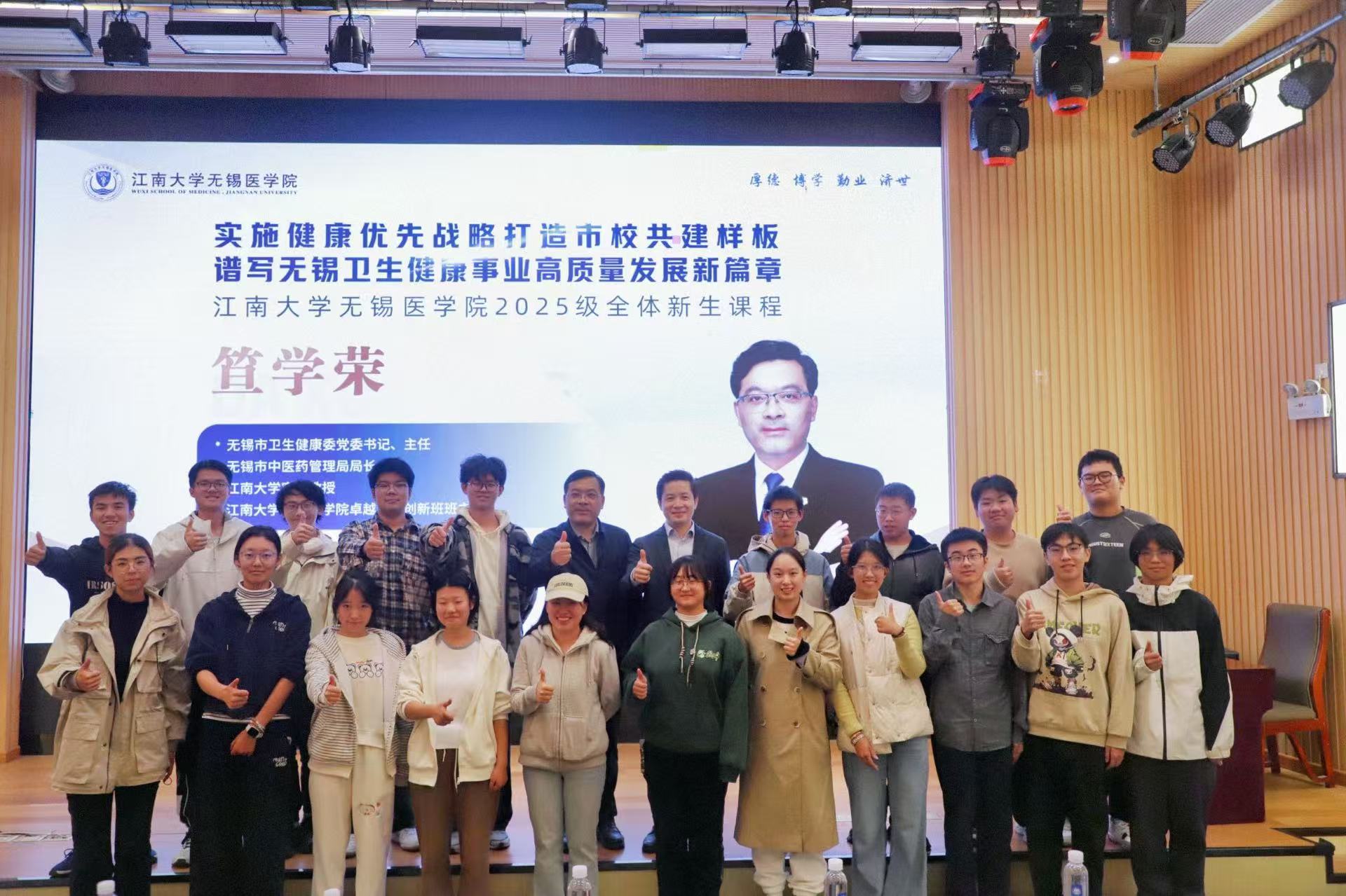 深耕市校共建沃土,共育卓越医学良才。2025年11月11日下午,无锡市卫生健康委员会党委书记、主任笪学荣应邀做客医学院“杏林春暖”大讲堂,为2025级全体本科新生作题为“实施健康优先战略 打造市校共建样板 谱写无锡卫生健康事业高质量发展新篇章”的专题报告。江南大学党委常委、副校长、无锡医学院院长马鑫,无锡医学院党委书记向琪,无锡医学院执行院长孙宁,副院长代卉,2025级全体本科生参加专题报告会,报告会由无锡医学院党委副书记、副院长包羽主持。
