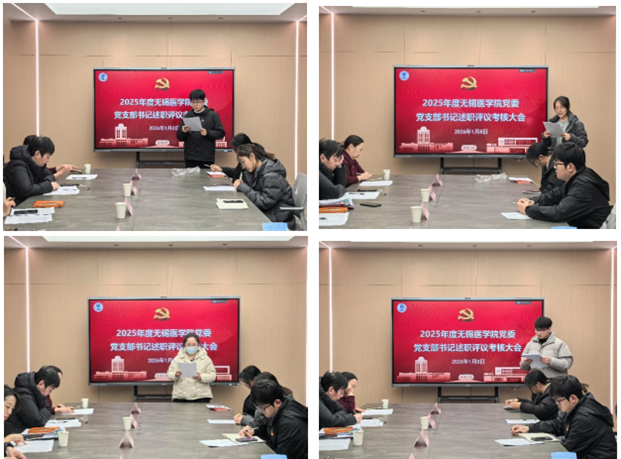 为深入贯彻落实新时代党的建设总要求,进一步加强基层党支部标准化规范化建设,2026年1月8日,无锡医学院党委在医学院C218会议室召开2025年度党支部书记述职评议考核大会。学院党委领导班子成员、各党支部书记及支部委员参会,学院分团委书记胡晓丹主持。