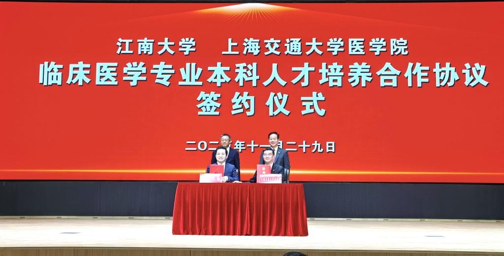 11月29日,我校与上海交通大学医学院临床医学人才培养合作签约仪式在上海举行。上海交通大学副校长、医学院院长、中国工程院院士范先群,江南大学校长、中国工程院院士陈卫出席签约仪式。江南大学党委常委、副校长,无锡医学院院长马鑫与上海交通大学医学院党委副书记、副院长吴正一签署合作协议。无锡医学院党委书记向琪、执行院长孙宁及学院领导班子等相关同志陪同参加。签约仪式由上海交通大学医学院副院长毕宇芳主持。