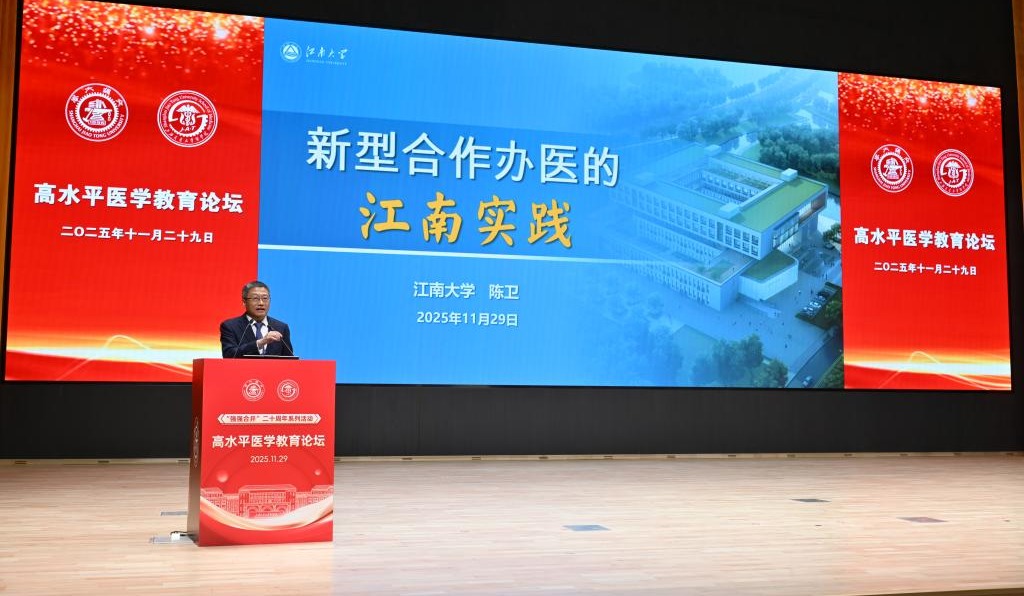 陈卫以“新型合作办医的江南实践”为题作专题汇报。他详细介绍了无锡市和江南大学选择合作办医的初衷和需求,经历十余年的发展,在无锡市委市政府政策和经费保障下,学校通过“医学学科特区”、职称评审“医学通道”等创新举措,助力无锡医学院建成临床医学“本科—硕士—博士”完整的医学人才培养体系,获批高水平科研平台,医学学科能级显著增强。