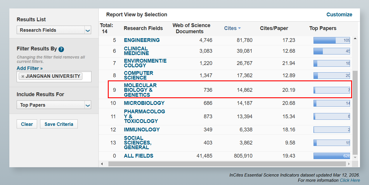 ESI(Essential Science Indicator)2026年3月12日最新数据显示,江南大学分子生物学与遗传学(MOLECULAR BIOLOGY & GENETICS)论文736篇,总被引次数14862次,首次进入ESI全球排名前1%,全球排名第1185位,学校学科建设又取得重要进展。
